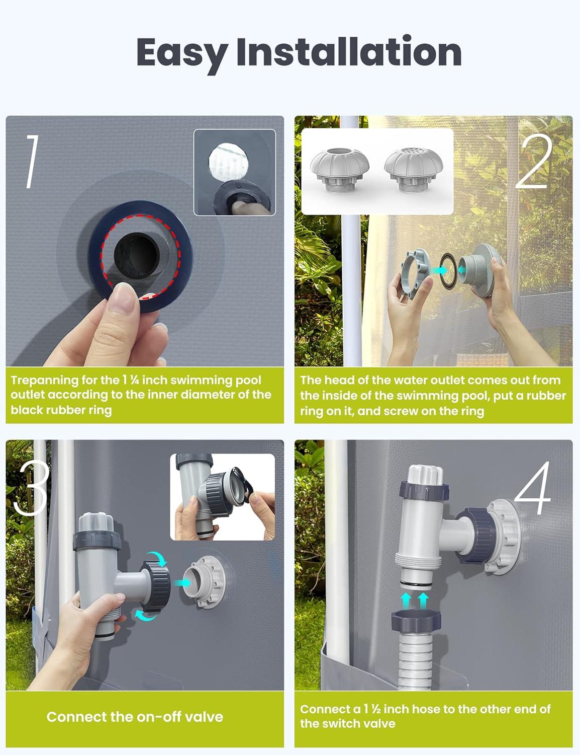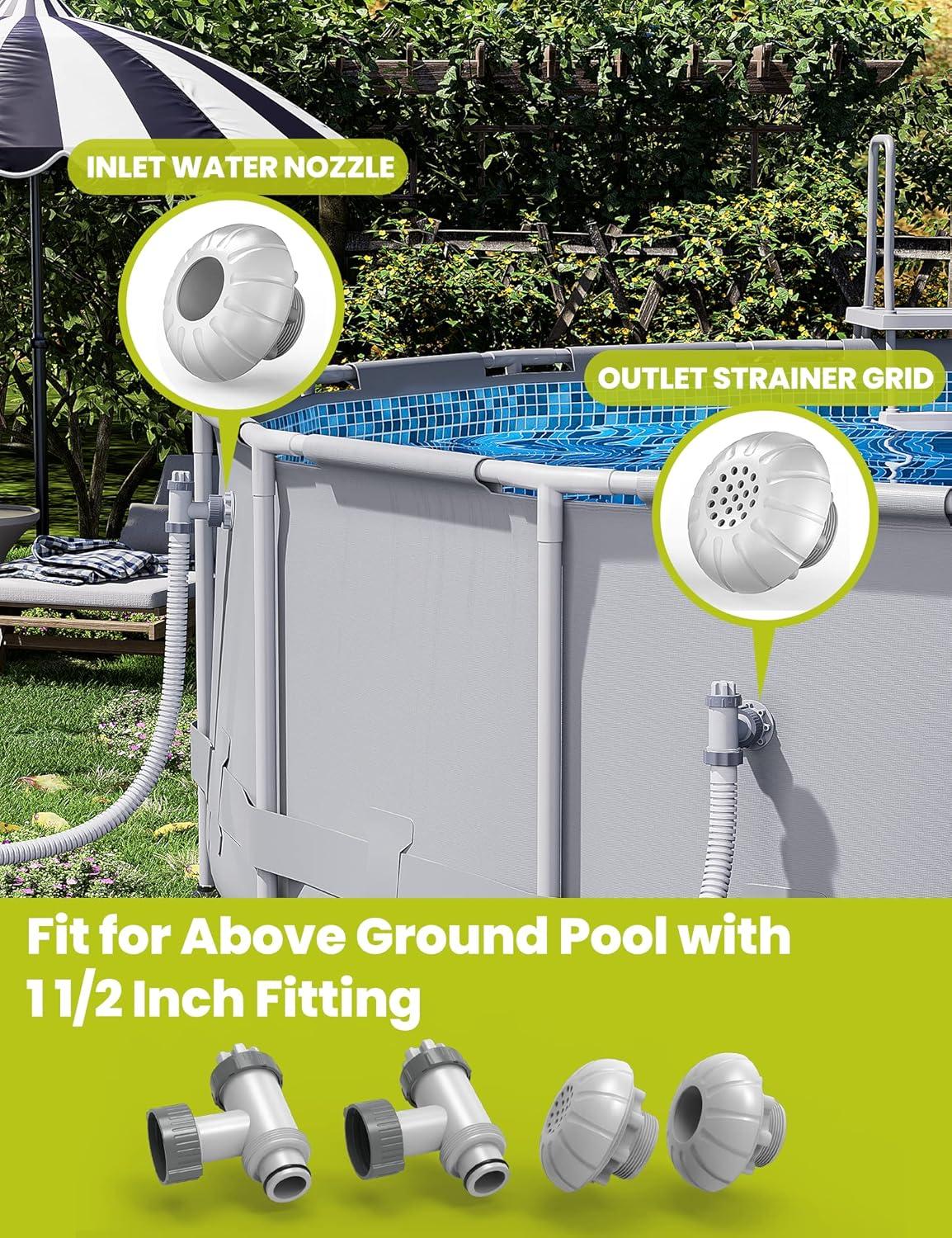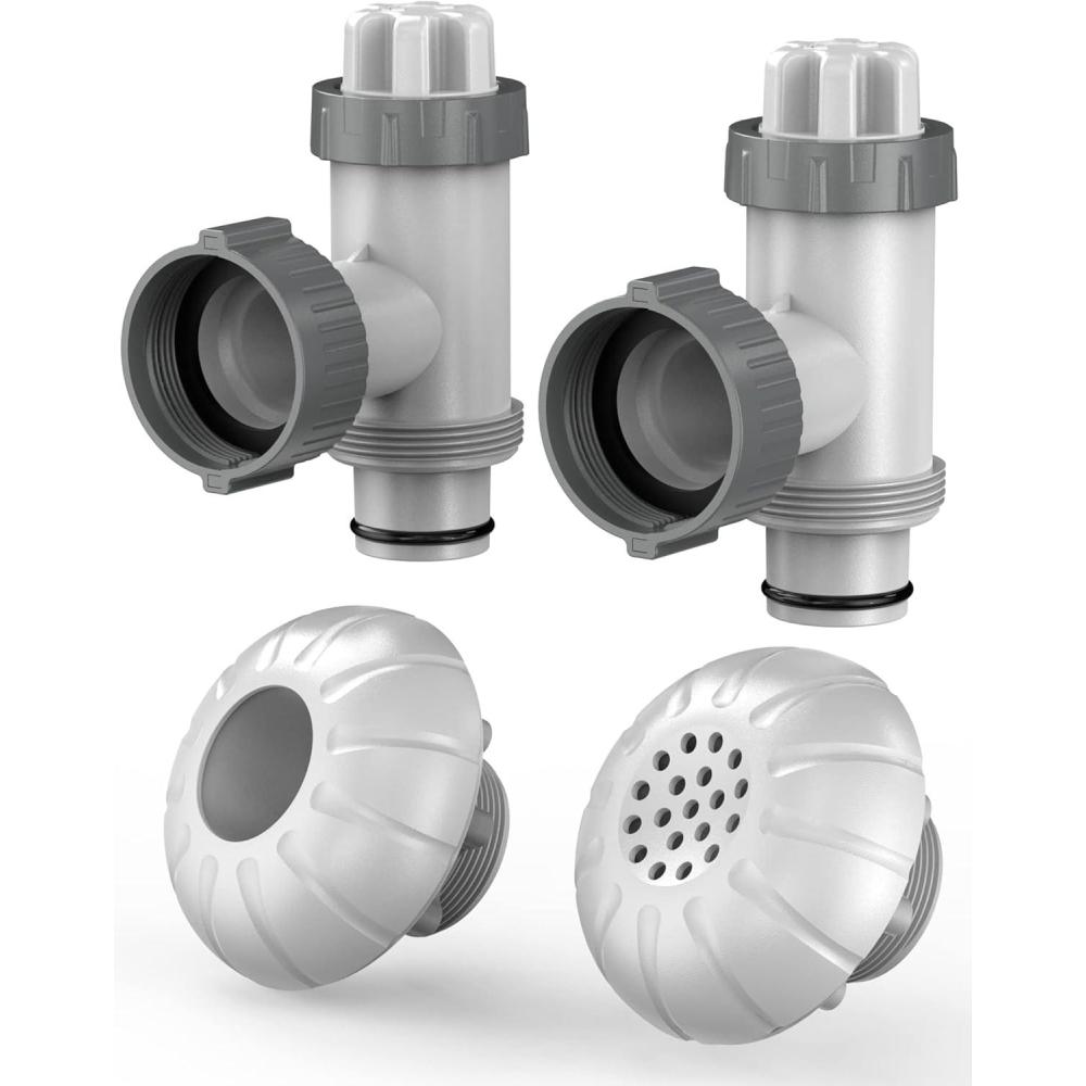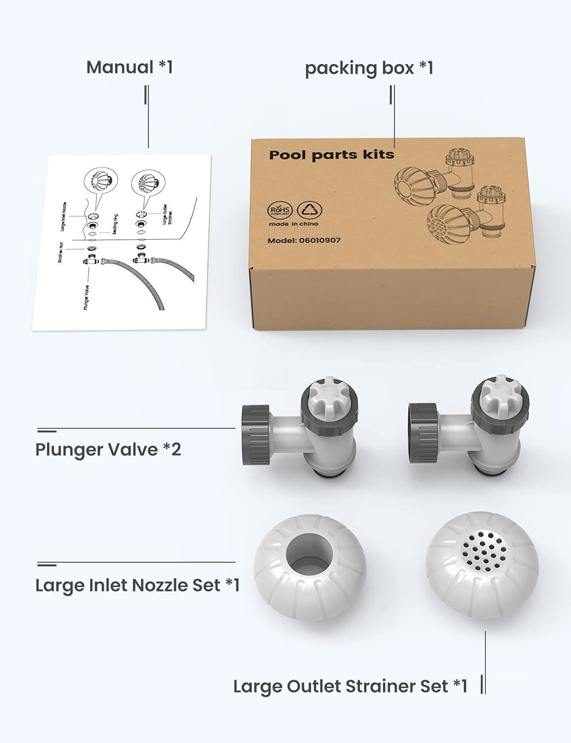 What You Get – This kit includes 2* pool plunger valve, 1* 1.5″ fitting outlet strainer grids, and 1* 1.5″ fitting inlet water nozzle.