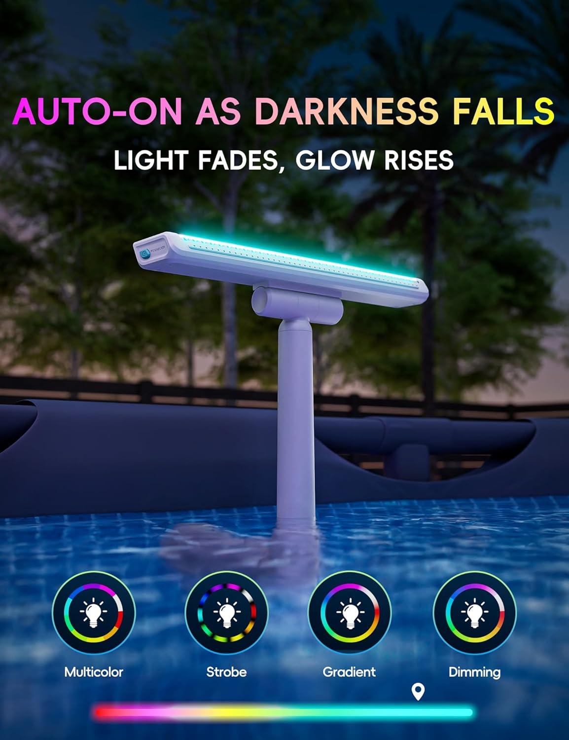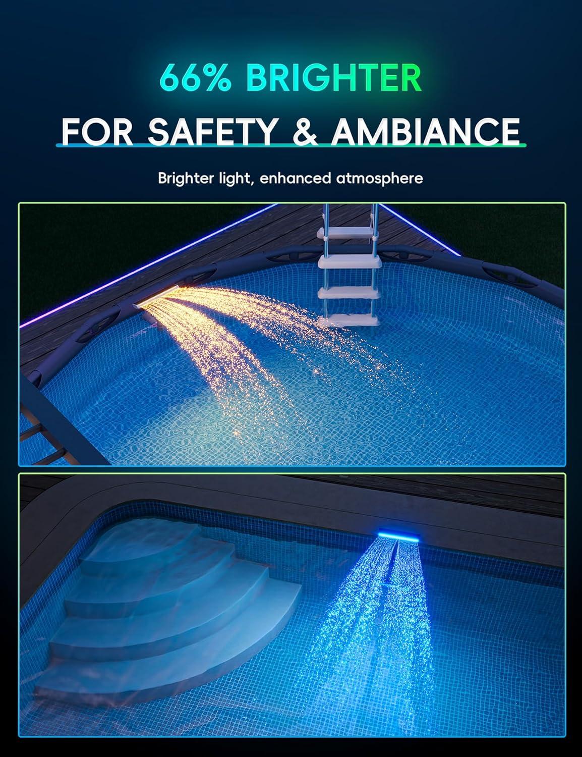 🌈IMMERSIVE GLOW & SECURITY – With 5000 LUX ultra-bright lighting, your pool becomes a radiant oasis. Choose from 10 vibrant colors and 4 dynamic modes, powered by 32 high-quality LEDs for rich hues. The curved diffuser ensures even, soft illumination. Perfect for family nights, pool parties, or romantic swims. Need security? Crank it to 100% brightness to light up the night!