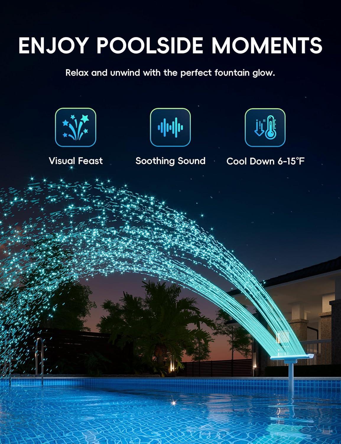 💦CUSTOMIZABLE WATER SHOW – Adjust the fountain riser, nozzle, and adjustable ball to control the angle, height, and direction of the spray. The pressure regulator adjusts spray distance and pool filtration, while the soothing sound of water provides a relaxing experience. Combined with changing lights, it creates a mesmerizing water-light show while cooling the pool by 6-15℉.